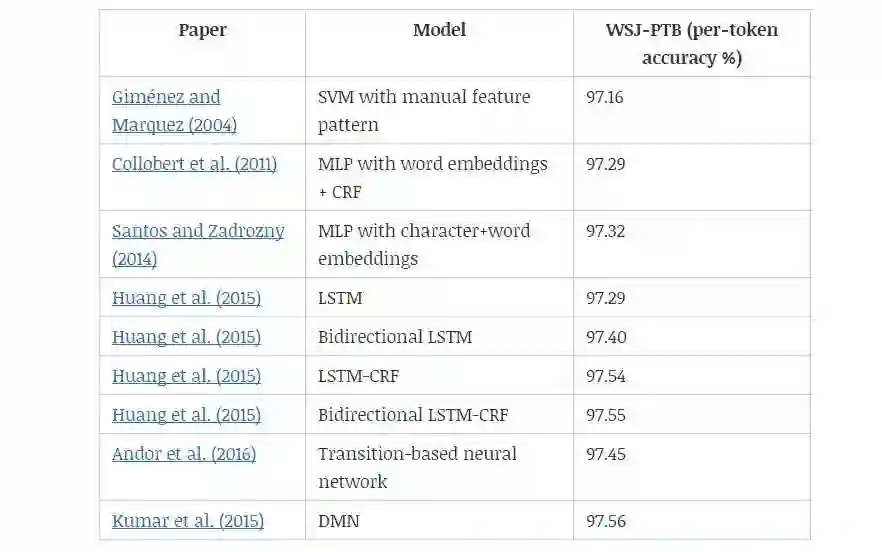 WSJ-PTB(the Wall Street Journal part of the Penn Treebank Dataset)语料库包含 117 万个 token,已被广泛用于开发和评估词性标注系统。Giménez 和 arquez(2004)在 7 个单词窗口内采用了基于人工特征的一对多 SVM,其中有些基本的 n-gram 模式被评估用来构成二元特征,如:「前一个单词是 the」,「前两个标签是 DT NN」等。词性标注问题的一大特征是相邻标签之间的强依赖性。通过简单的从左到右标注方案,该方法仅通过特征工程建模相邻标签之间的依赖性。