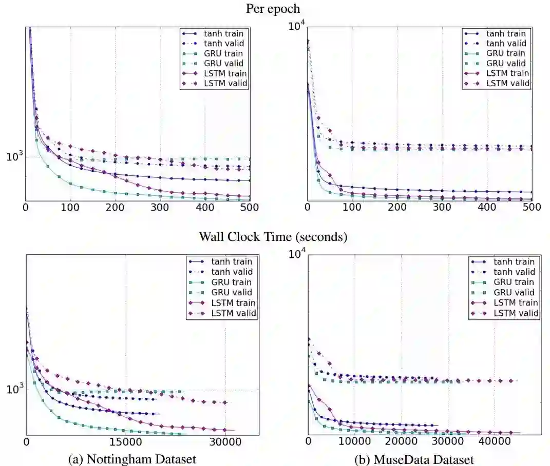 图 11:不同 RNN 变体在训练集和验证集上的学习曲线,上图 x 轴表示迭代次数,下图 x 轴表示挂钟时间,y 轴表示模型的负对数似然(以对数标尺显示)。
