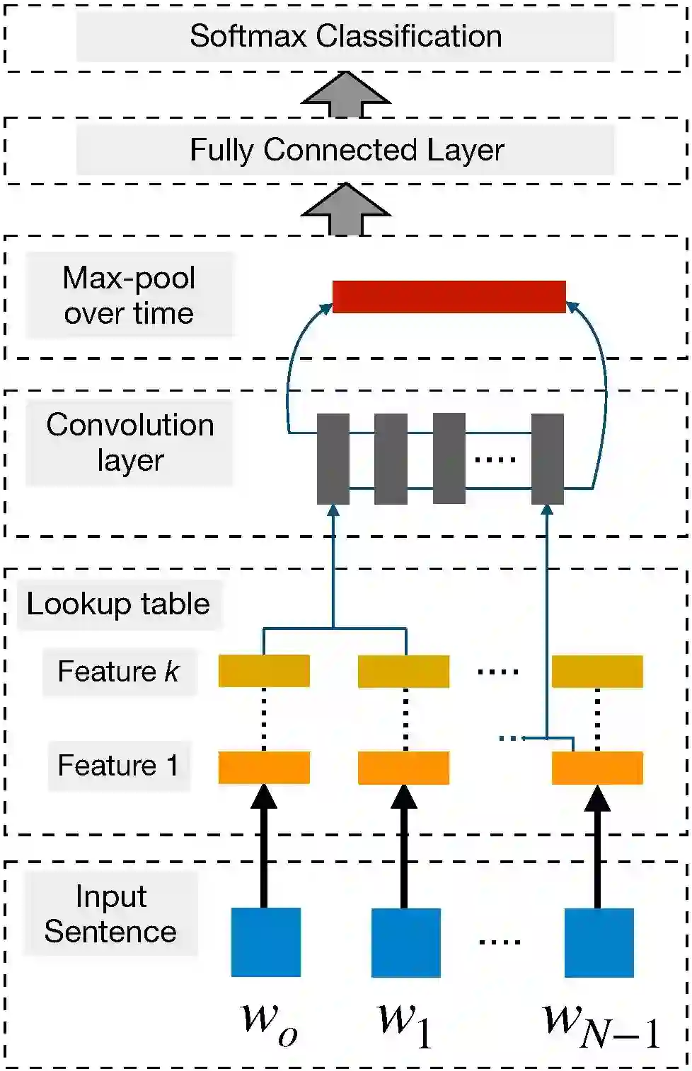 情感分类等任务还需要有效地抽取 aspect 与其情感极性(Mukherjee and Liu, 2012)。Ruder 等人(2016)还将 CNN 应用到了这类任务,他们将 aspect 向量与词嵌入向量拼接以作为输入,并获得了很好的效果。CNN 建模的方法一般因文本的长短而异,在较长文本上的效果比较短文本上好。Wang et al. (2015) 提出利用 CNN 建模短文本的表示,但是因为缺少可用的上下文信息,他们需要额外的工作来创建有意义的表征。因此作者提出了语义聚类,其引入了多尺度语义单元以作为短文本的外部知识。最后 CNN 组合这些单元以形成整体表示。