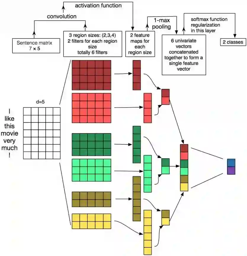 Kim 探讨了使用上述架构进行各种句子分类任务,包括情感、主观性和问题类型分类,结果很有竞争力。因其简单有效的特点,这种方法很快被研究者接受。在针对特定任务进行训练之后,随机初始化的卷积内核成为特定 n-gram 的特征检测器,这些检测器对于目标任务非常有用。但是这个网络有很多缺点,最主要的一点是 CNN 没有办法构建长距离依存关系。