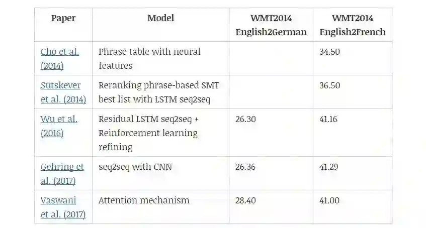 基于短语的 SMT 框架(Koehn et al., 2003)将翻译模型分解为原语短语和目标语短语之间的概率匹配问题。Cho et al. (2014) 进一步提出用 RNN 编码器-解码器框架学习原语与目标语的匹配概率。而基于循环神经网络的编码器-解码器架构,再加上注意力机制在一段时间内成为了业内最标准的架构。Gehring et al. (2017) 提出了基于 CNN 的 Seq2Seq 模型,CNN 以并行的方式利用注意力机制计算每一个词的表征,解码器再根据这些表征确定目标语序列。Vaswani et al. (2017) 随后提出了完全基于注意力机制的 Transformer,它目前已经是神经机器翻译最常见的架构了。