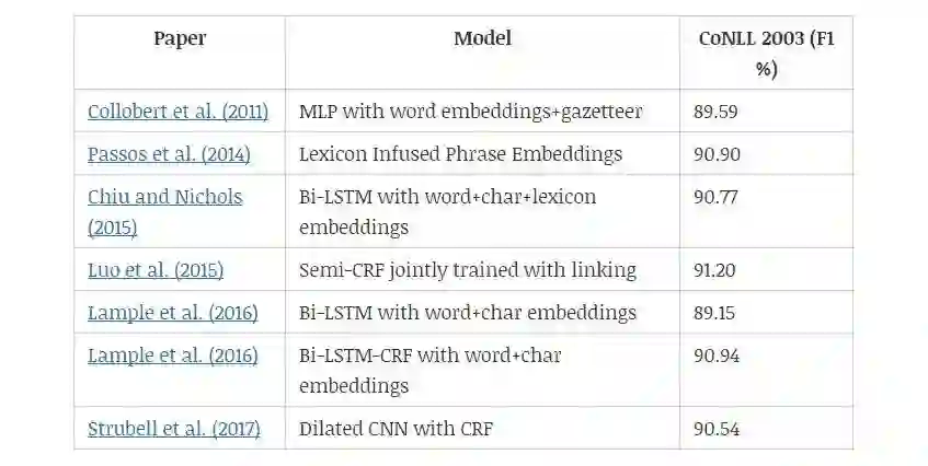 CoNLL 2003 是用于命名实体识别(NER)的标准英语数据集,其中主要包含四种命名实体:人、地点、组织和其它实体。NER 属于自然语言处理问题,其中词典非常有用。Collobert 等人(2011)首次通过用地名索引特征增强的神经架构实现了具有竞争性的结果。Chiu and Nichols(2015)将词典特征、字符嵌入和单词嵌入串联起来,然后将其作为双向 LSTM 的输入。