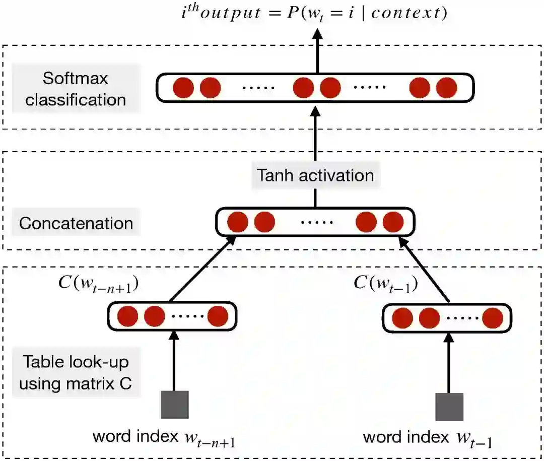 第一种在低维空间中学习密集型的分布式词表征是 Yoshua Bengio 等人在 2003 年提出的 A Neural Probabilistic Language Model,这是一种基于学习而对抗维度灾难的优美想法。