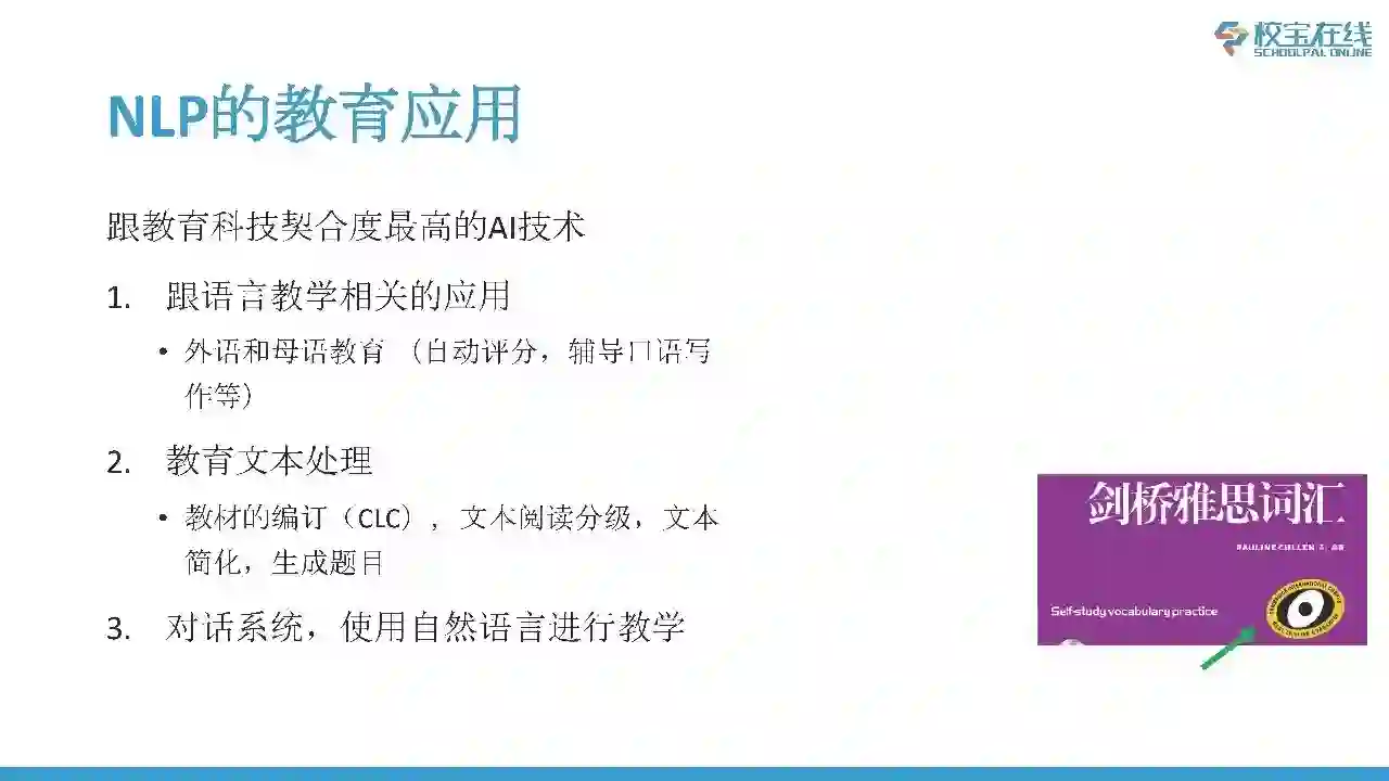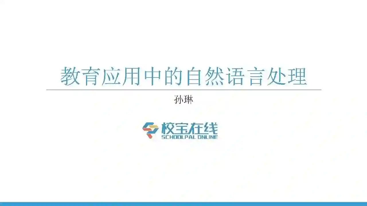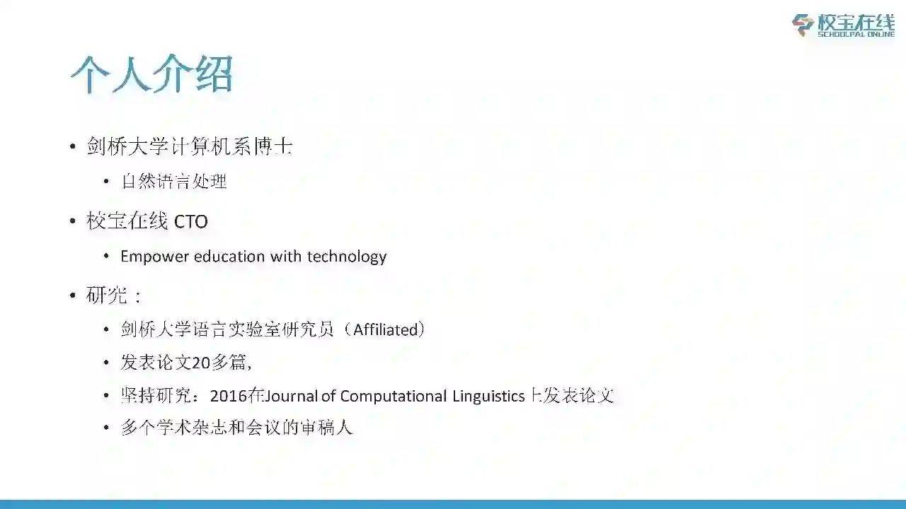 大家好!我是孙琳,很高兴参加TAB教育科技论坛,今天分享的题目是“教育应用中的自然语言处理”。首先我先做一下自我介绍,我是剑桥大学计算机系的博士,博士研究的方向是自然语言处理, 2011年的时候,我们一起创立了校宝在线的前身,当时就想要把自然语言处理的技术用在教育当中。校宝在线的业务是为中国的民办学校提供SaaS解决方案,包括ERP、LMS等,同时把人工智能的技术应用在这些软件解决方案当中。我自己在业余时间还保持做研究,目前是剑桥大学语言实验室的研究员,每年还会坚持发Paper,同时也是很多学术杂志和国际会议的审稿人。