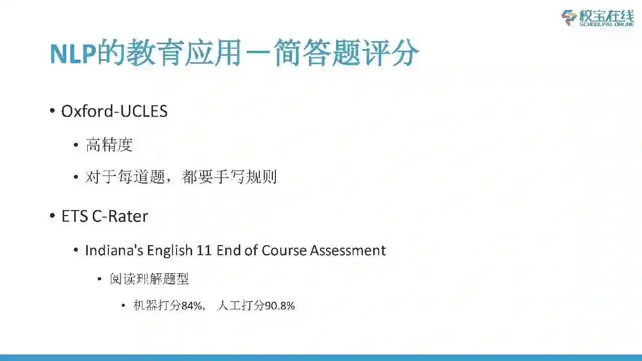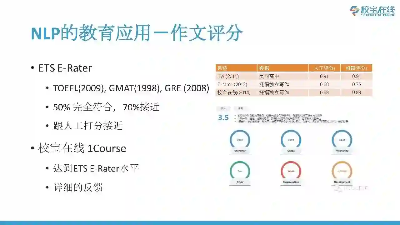 NLP和教育结合的第一个应用是作文打分,这是成熟的应用。ETS E-Rater用在托福、GMAT、GRE考试当中了。现在考托福,写作里面一部分分数是电脑自动评分的。ETS E-Rater和人工的打分数据非常接近了。我们校宝在线1Course也可以达到ETS E-Rater水平,而且可以给出详细的反馈。我们不仅会给出分数,而且会给出非常详细的学习建议以及得分的要点。