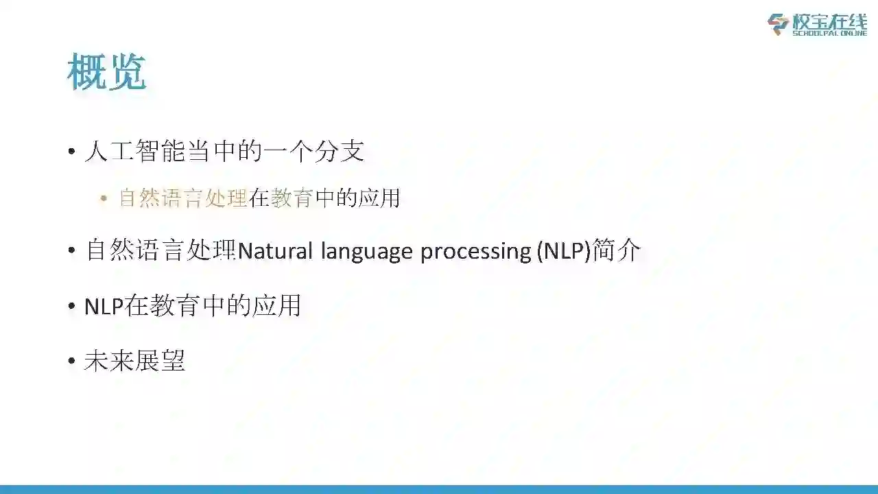 自然语言处理的英文是Natural language processing,简称NLP。所以我下面说到NLP的时候大家应该能够反应出来NLP是自然语言处理。首先跟大家介绍一下NLP,然后说一下NLP在教育中的应用,最后我说一点自己的结论以及我自己对未来的一点展望。