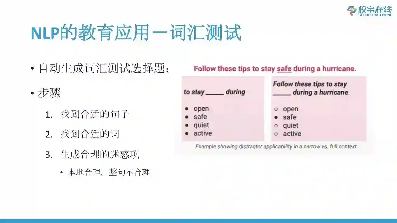 另外一个应用是“词汇测试”,我在国内看到的比较少,在欧洲、美国看得蛮多的,它是对于词汇自动生成选择题。给定一篇文章,计算机自动根据学习者的水平找到合适的句子,找到合适的词然后自动生成迷惑项,自动生成学生的练习题。这个好处是老师不需要提前对于阅读理解、阅读材料或者词汇掌握情况准备,只需要准备阅读材料就好了。原理和步骤:(1)找到学习者能够读懂的句子;(2)找到适合他水平的待测试的词;(3)生成迷惑项。迷惑项的生成很有讲究,迷惑项要足够迷惑才可以,它们在非常小的上下文里面都是可以讲得通的,但是放在整句当中正确的只有一个,最大化他的迷惑性,最大化测试的效果,这个应用在国内的见的不是特别的多。