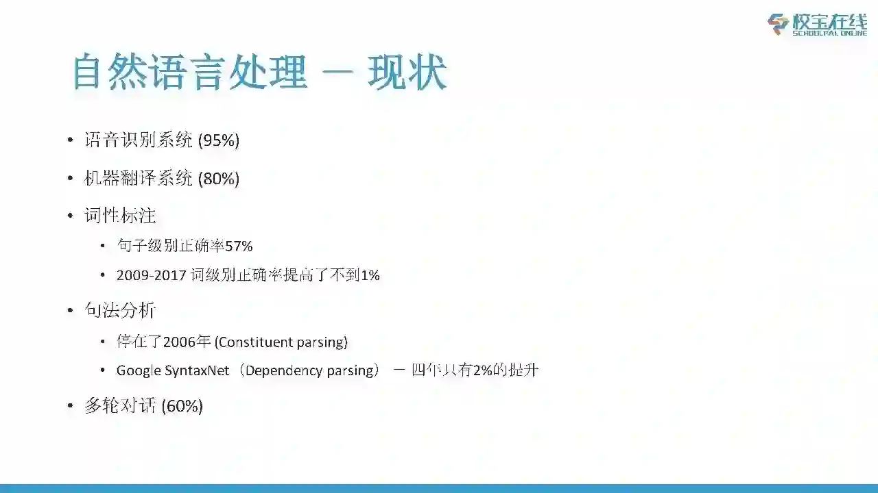 目前我们已经有非常好的语音识别系统了,现在基本上达到了人类的水平,在理想环境里可以达到95%以上的正确率。同样我们也有比较正确的机器翻译系统,正确率换算过来也可以有70%到80%,虽然离人的水平还有一定的差距,但是已经是可用的状态。除了这两个以外,自然语言处理(NLP)的应用目前进展不大。举一个最简单的例子,比如词性标注,在一个句子当中,动词、名词、形容词,这个任务是非常简单、非常基础的任务。但是句子级别(一句话一个词不错才算对)目前的正确率只有57%,而且从2009年到2017年间正确率提高了不到1%,无论使用深度学习、各种模型、各种方法,花了八年时间也是只是提高了不到1%。