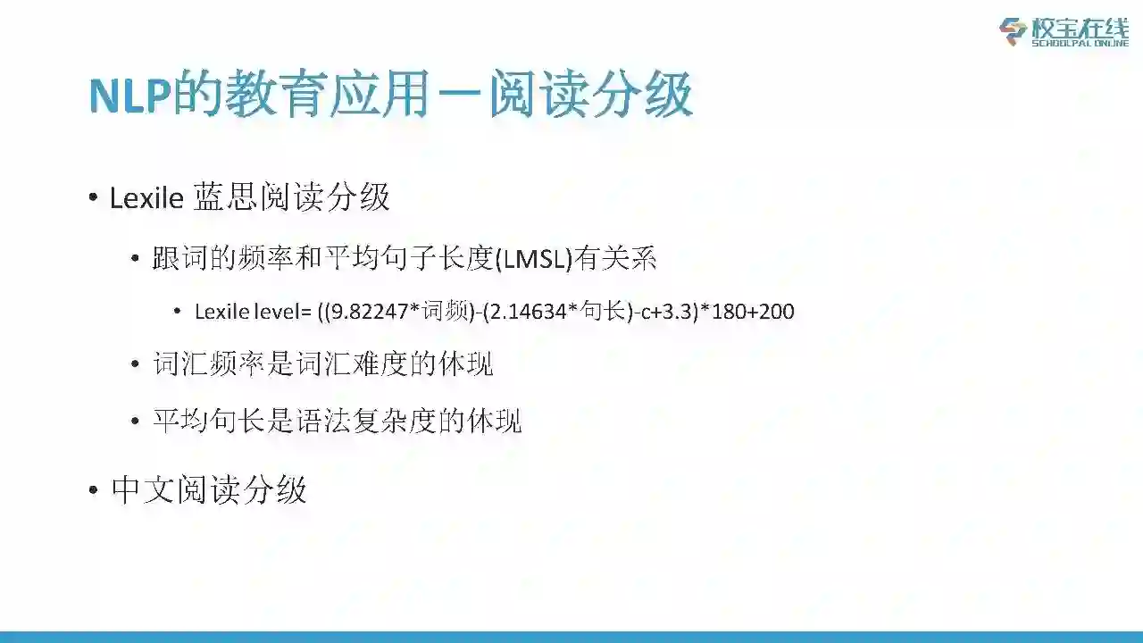 下面一个常见的应用是阅读分级。大家可能听说过蓝思(Lexile)阅读分级,这里面涉及到两个关键信息:词汇频率和平均句子长度。其实词的频度是词汇难度的表现,在大的语料库和文本当中,比如说所有的人民日报或其他报纸,如果一个词汇少见可能就是比较难的词。平均句长是语法复杂度的体现。大家觉得蓝思(Lexile)阅读分级的算法不难,但它的效果是非常好的,它可以给利用计算机给很多的文本、书籍进行自动处理、分析这些书籍的难度,然后对于不同水平的学习者给他们提供不同难度的学习资料。