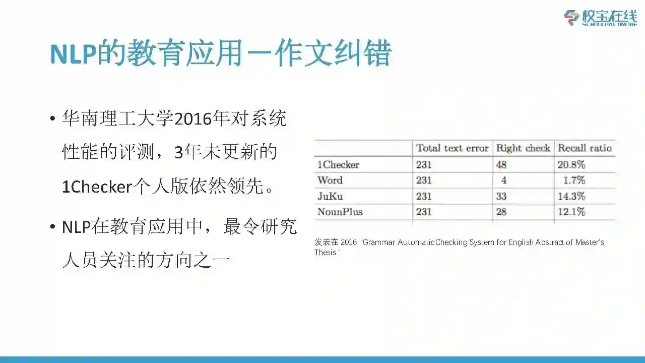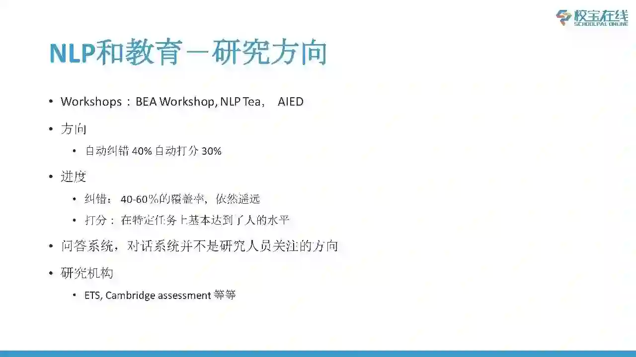 目前研究的方向还是主要集中于自动纠错和自动打分,我估算了一下,大体占到每年Paper发表量的70%。从目前自动纠错研究来看,只有40%到60%比例的错误是可以被检测并改正的,离人的水平、教师的水平依然是非常遥远的。从目前自动打分研究来看,特定任务上面,比如是托福、雅思这种应试作文上面基本上已经达到了人的水平,但是对于更有挑战性的文本目前也处于一个停滞不前的状态,也没有很大的突破。另外一个问答系统、对话系统,和学生的个人助手,类似这种研究相对来说并不是特别多,主要原因是由于这些方面需要基础研究层面有更大的突破,才能在教育应用中更好的找到自己的一席之地。目前主要的两个研究机构是ETC和Cambridge assesment。