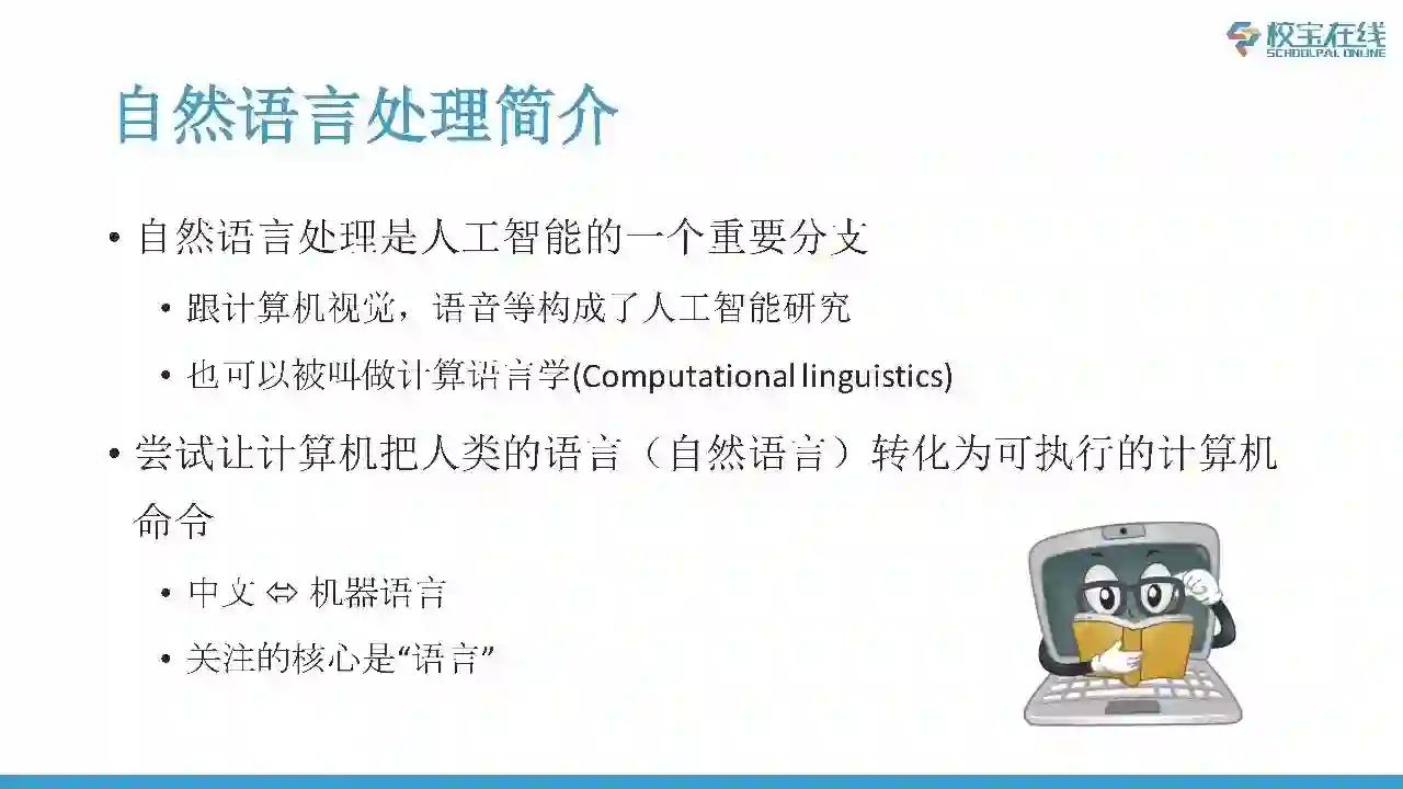 自然语言处理其实是人工智能里面一个非常重要的分支,其他的分支大家也非常了解,比如说计算机视觉、语音,包括机器学习、深度学习,这些都是人工智能的分支,它也常常被叫做计算语言学。它核心的目标就是把人的语言也就是自然语言转换成计算机可以执行的命令。简单来说就是让计算机读懂人的语言。所以说NLP关注的核心其实是语言或者更通俗一点来说是文本。