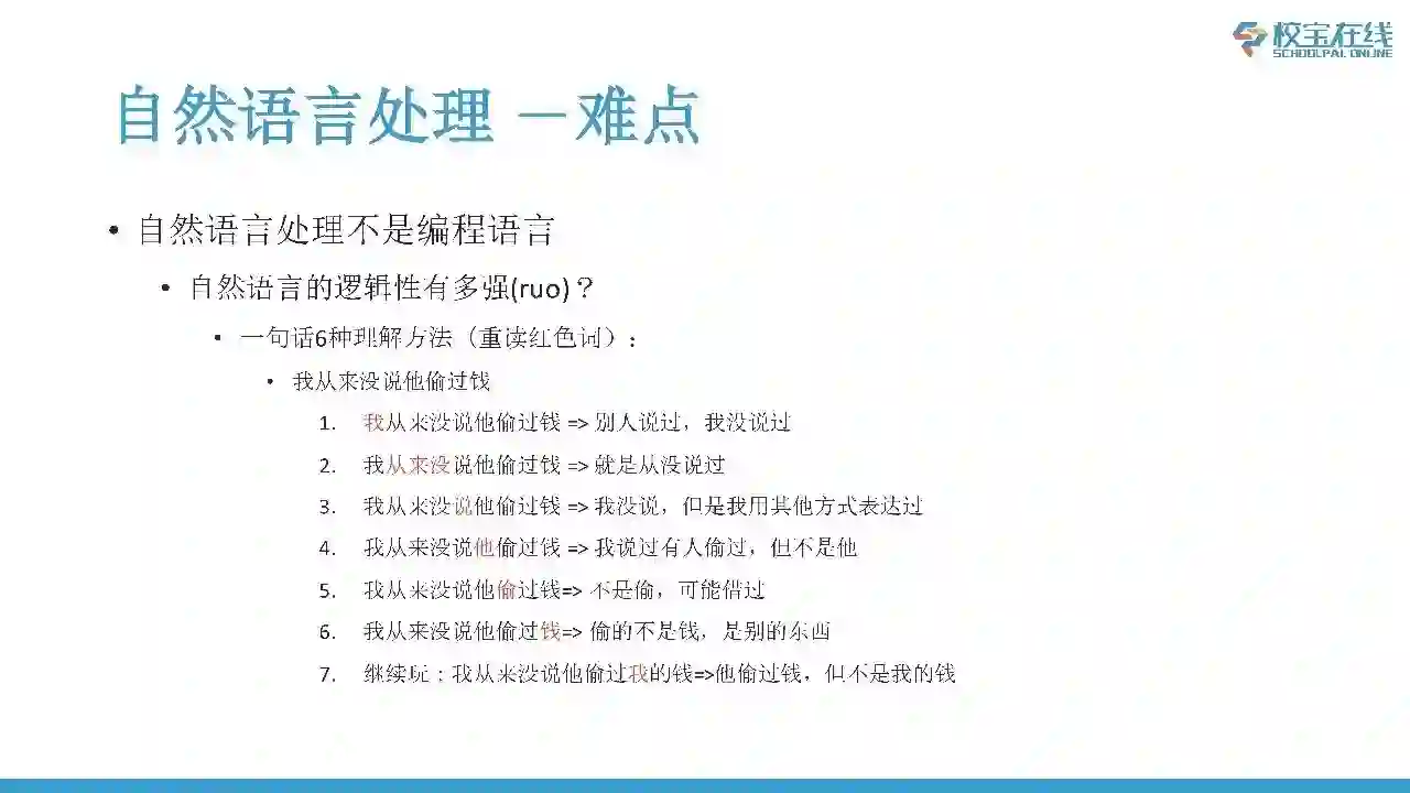 自然语言处理,我个人认为是人工智能领域里面最难的一个领域,它最大的难点在哪里?首先,因为自然语言处理相对于语音和视觉来说是高度抽象化的表现,它不是信号,而是一些非常抽象化的理念。大家都认为人类的语言有非常强的逻辑性,其实人类的语言逻辑性并不强。我给大家举一个例子,大家看这句话“我从来没说他偷过钱。”这句话有6种理解方法,我一一列出来了。比如说我可以这么来说:“我从来没说他偷过钱。”这个意思就是可能别人说过,但是我没有说。第三个可以说“我从来没有说他偷过钱”,可能我确实没有说,但是我用其他的方式暗示过。除了这6种以外,如果把这个句子加长的话,变成“我从来没说他偷过我的钱。”那么就有7种解释,不光有1到6,还有第7种解释,这个句子可以变得更长,这个歧义就会更多。对于计算机来讲,如果单单给它这一句输入,要做到真正语境上的理解是不可能的事情。要做到真实语境上的理解可能需要更多的辅助信息和上下文的信息,不然是没有任何可能性的。