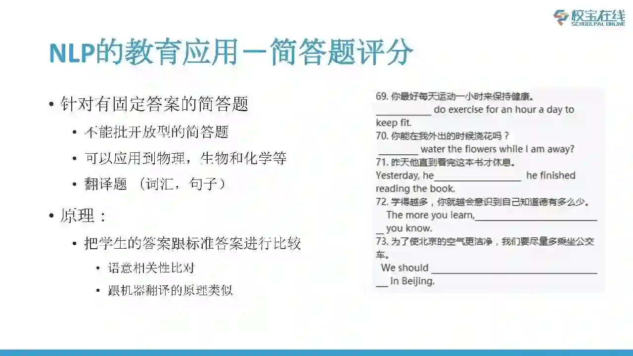 其他的应用包括简答题的评分,简答题的自动评分其实是只能针对于有固定答案的非开放性的简答题。什么叫做开放性的简答题?比如说你最难忘的一件事情,这是开放性的。非开放性的,指的有几套固定答案的,或者让你描述一个现象,这些都属于可以自动批改的简答题。原理上面跟机器翻译很相似,把学生的答案和正确的答案进行比较。目前来说国际上面有两套比较通行的简答题评分的引擎,一个是牛津的那套,精度非常高,对于每道题都要手写规则。还有一个非常成功的是ETS E-Rater,在某些任务当中可以达到人的水平。