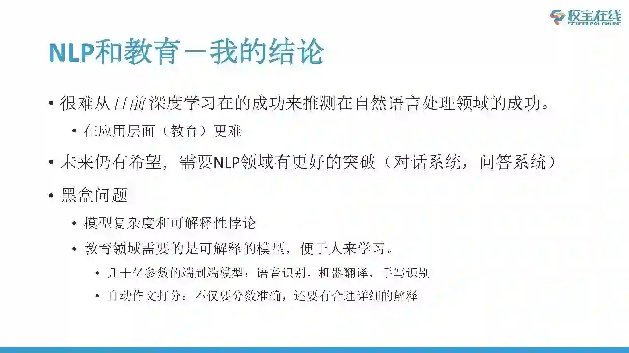 另外还有一个非常难受的问题即黑盒问题,这是教育行业一个非常特殊的需求。因为深度学习这种模型都是高度非线性的、非常复杂的模型,尤其现在流行的是端到端,你给我输入输出就行了,中间完全用模型搞定,人干预的地方很少。那问题来了,对于教育来说往往需要的不仅仅是一个准确的结果,还需要你推理的过程。比如说我做打分,分数正确是很重要,但是对于学生来说需要知道为什么得了这个分数,具体哪写的不好,怎么改进。对于全黑盒的模型来说,即便是深度学习最终革新了NLP,大大提高了NLP任务的准确度,可是对于老师还是学生来说还是很难读懂和解释的。这个黑盒问题怎么解决,也是需要研究人员想办法的。