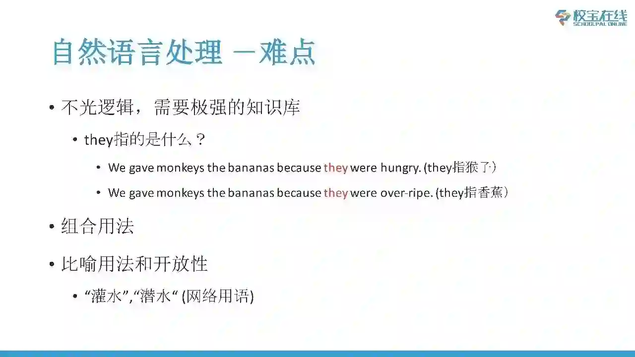 其次,我们要理解人的语言不能光靠逻辑,还要有非常强的知识库,要有很多知识才能正确理解人类语言。我举个例子,下面两句话中,第一句话We gave monkeys the bananas because they were hungry。这个地方的they指猴子。第二句话We gave monkeys the bananas because they were over ripe。这个地方的they指香蕉。对于计算机来说这两句话看起来结构非常相似,句式也非常类似,所以计算机必须知道猴子饿了,香蕉不能饿,猴子不能烂的,香蕉才能烂,才能对这句话有一个正确的理解,不然是完全无法知道。