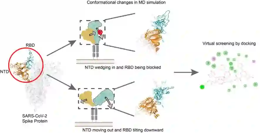 研究发现,RBD 有 down 和 up 两种状态,只有 up 状态才有可能与人的受体蛋白做识别。该项研究发现,RBD 倾向于从 up 的状态转变为 down 的状态,而当 NTD 像楔子一样塞入 RBD 下端时,阻止了 RBD 的这一倾向,即 NTD 使得 RBD 保持 up 状态,进一步让其拥有了感染的能力。