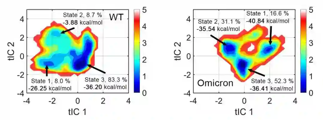 图3:分子动力学模拟揭示奥密克戎的状态变化及感染机理(左图为新冠病毒 S 蛋白,右图为奥密克戎变异株的 S 蛋白,其中两个体系的 State3 基本一致且为主要构象,奥密克戎的另外两个亚态结合自由能明显高于新冠病毒的两个亚态)