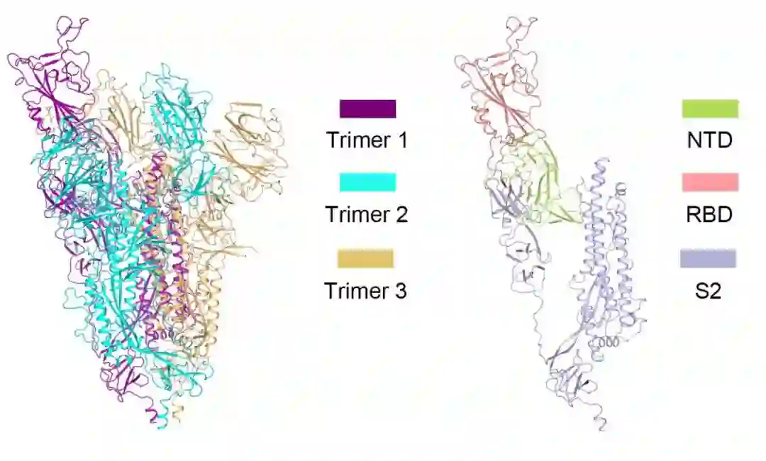图1:新冠病毒 S 蛋白结构(左图为 S 蛋白三聚体结构,由三条链组成;右图为 S 蛋白单体结构,由 NTD、RBD 以及 S2 组成)