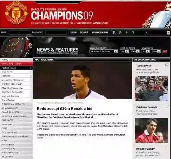 2009 年的夏天,英国格林尼治时间 6 月 11 日上午 9 点 30 分,英超曼联俱乐部在官方网站发表声明说,他们接受了皇家马德里一份价值高达8000万英镑(约合9400万欧元,9亿人民币)的求购葡萄牙球星克里斯蒂亚诺-罗纳尔多的报价。