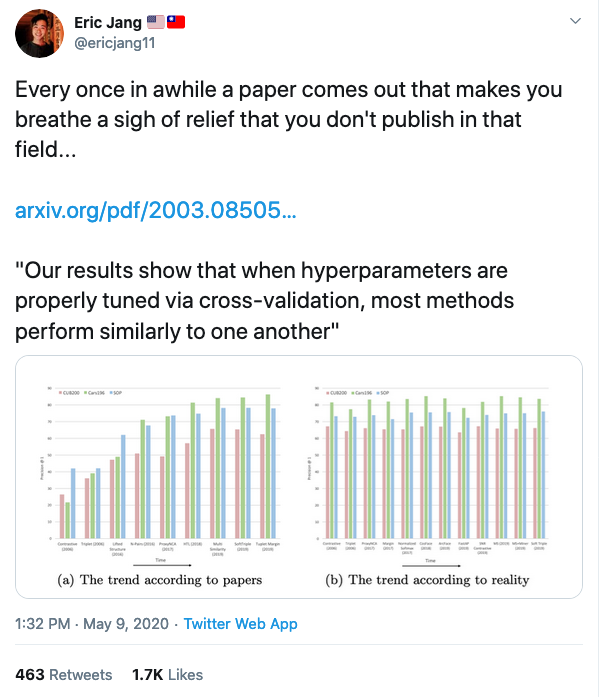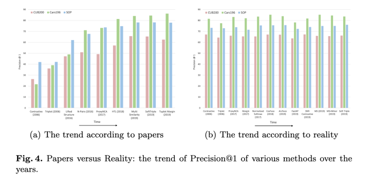 Facebook AI 和 Cornell Tech 的研究人员近期发表研究论文预览文稿,声称近十三年 (deep) metric learning 领域的研究进展(ArcFace, SoftTriple, CosFace 等十种算法) 和十三年前的基线方法(Contrastive, Triplet) 比较并无实质提高,近期发表论文中的性能提高主要来自于不公平的实验比较,泄露测试集标签,以及不合理的评价指标。