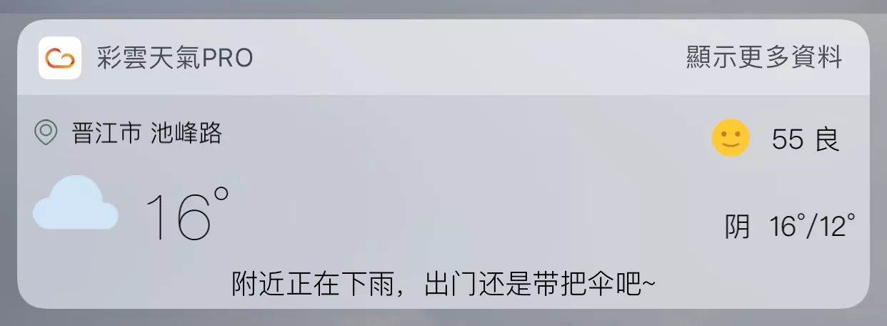 「彩云天气」的小部件不仅能实时为我提供我所在街道的天气情况,还能实习更新降雨预测,如:「30 分钟后雨渐小,转为小雨」,对自己出行起到了一定的帮助。