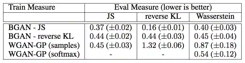 在MNIST上与WGAN-GP(梯度惩罚)的比较显示,采用多种距离衡量,包括Wasserstein距离,BGAN都取得了更优的表现: