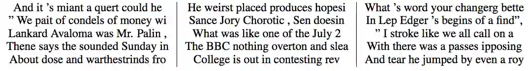 下为随机选取的在1-billion word数据集上训练的BGAN上生成的文本的3个样本: