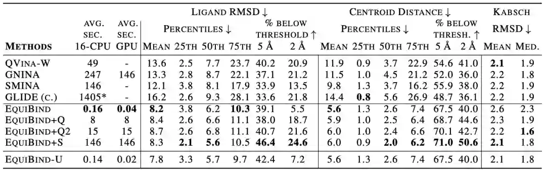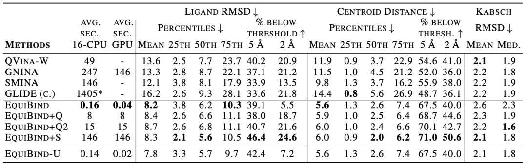 从结果上看,EquiBind在各项指标上均显著优于其他模型。该优势主要体现在Centroid Distance:即EquiBind能够正确找到小分子的结合口袋。同时,EquiBind的运行时间也显著优于其他方法。