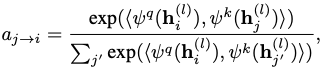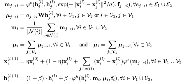 其中N(i)是节点i的邻居节点,ϕ x是实值参数函数;W是可学习矩阵。ϕ h , ϕe是输出向量R的参数函数(MLPs)。fj→i 和 fi是原始边和节点特征(从残基中SE(3)等变提取).aj→i是一个基于注意力的系数,具有可训练的浅层神经网络 ψ q 和 ψ k。