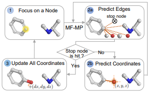 边和坐标的顺序预测图示。首先关注一个节点。然后,对关注节点和其他节点(包括人工停止的节点)之间的边进行采样。如果linker节点首先连接到现有图,则将预测其坐标。每次在预测之前,MF-MP都应用于从现有图中捕获信息。我们不断添加边,直到选择停止节点,然后同时更新现有图中所有linker节点的坐标。然后,我们重新关注一个新节点并重复。该过程将继续,直到linker中的所有节点都已关注。