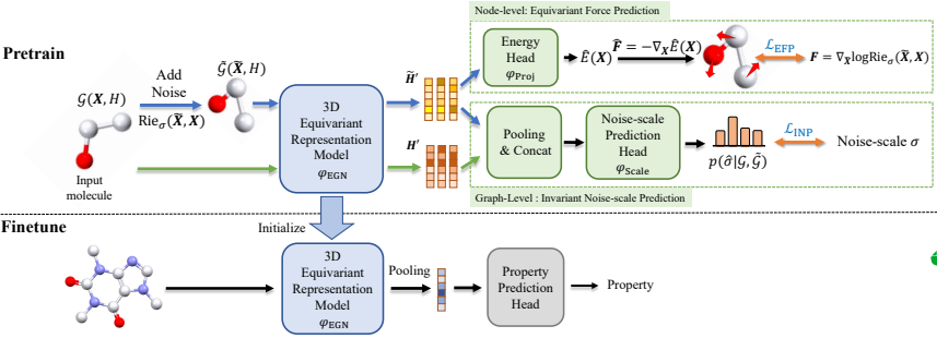 3D分子图预训练(3D-MGP)概述。它包括两个任务:等变节点级别的力预测和不变图级别噪声尺度的预测。是和黎曼-高斯分布有关