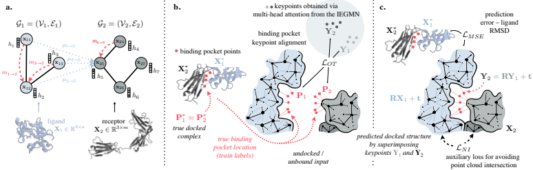 EQUIDOCK架构和损失函数的详细信息。a. IEGMN中的消息传递操作保证了两两独立SE(3)-等变。b. 使用额外的最优传输损失(OT, optimal transport loss)。预测与结合口袋位置对齐的每个蛋白质的关键点。c. 在预测对接位置后,计算配体上的MSE损失,以及防止两个蛋白交叉的损失。