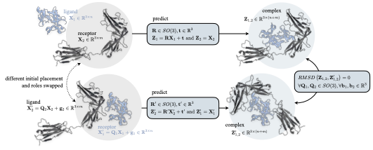 预测了一个刚性对接,将配体放置在受体的结合位置。在数学上保证输出相同的复合物构象--直到SE(3)变换-独立于初始未结合位置,旋转,或者两个蛋白的角色(配体和受体互换)