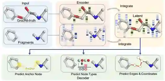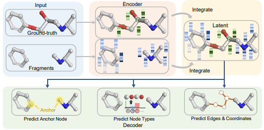 整体编码和解码过程的图示。对于编码,baselines:用MF-MP编码器获得节点级别表示。这些节点在片段中的表示将被丢弃,取而代之的是仅在片段图上单独计算的表示。对于解码,预测两个锚节点作为linker的结合位点。在连接之前,同时预测linker的节点类型。使用两个锚节点和linker的节点类型,可以顺序预测边喝坐标,如下图所示。