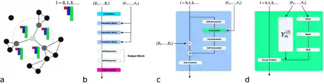 a.一组原子被解释为具有局部邻域的原子图。b.原子序数嵌入到 l=0特征中,通过一系列相互作用块进行细化,创建标量和高阶张量特征。一个输出块生成原子能量,这些原子能量被汇集后给出总预测能量。c.相互作用模块,包含卷积。d.卷积通过张量将径向函数R(r)和单位向量???的球偕投影与相邻特征的乘积相结合。