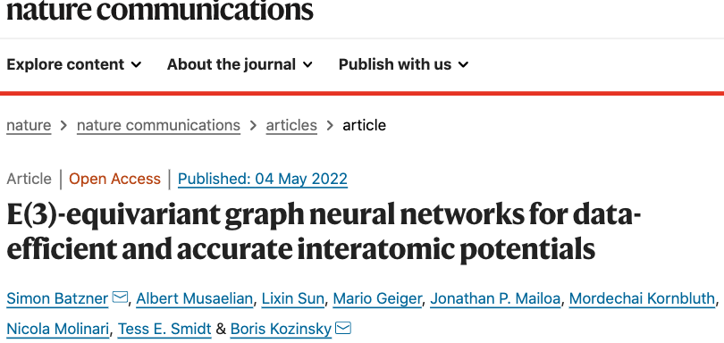 2022月5月4日,哈佛大学Soris Kozinsky团队在nature communications上发表了题为"E(3)-equivariant graph neural networks for data-efficient and accurate interatomic protentials"的文章,开发了基于等变图神经网络模型NequIP ,该模型在分子动力学模拟上,显示出出色的预测准确性、对未见阶段的泛化能力以及非常高的样本效率。