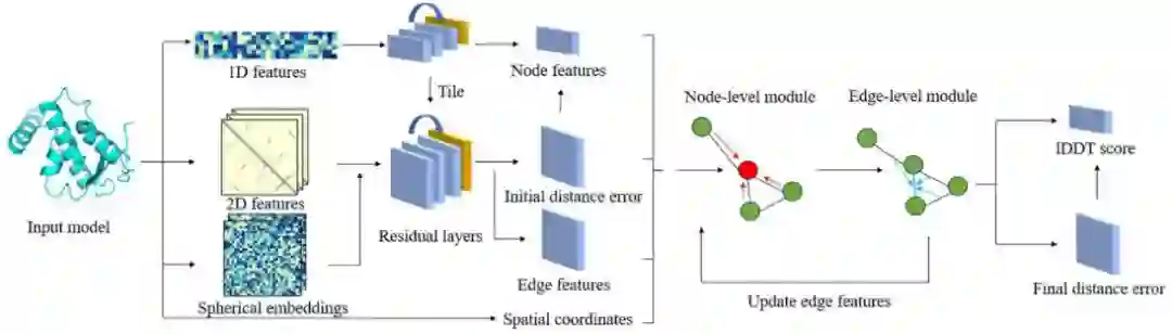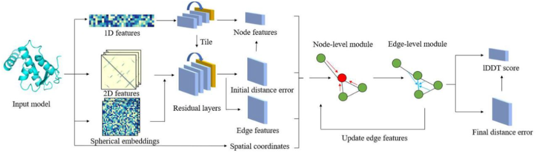 EnQA整体架构示意图。输入模型的1D/2D特征首先被转换为3D等变图模块的隐藏节点和边特征。残基Ca原子的空间坐标也被用作额外的特征。节点和边网络模块迭代地更新图特征。最后,通过3D等变网络从更新的节点/边特征和空间坐标预测残基对的每个残基IDDT分数和距离误差。