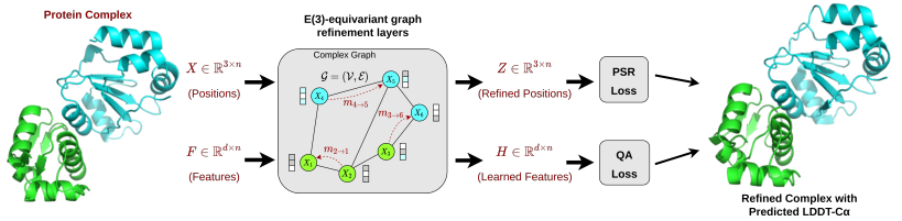 作者开发了等变图精调模型(EGR),一种E(3)等变图神经网络(GNN),用于多任务结构精调和蛋白质复合物的评估。