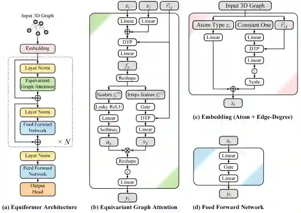 Equiformer的架构。利用原子的度和边的度的表征,用Transformers块编码3D图,Transformers块由等变图注意和前馈网络组成。”⊗” 表示乘法,”⊕” 表示加法和“DTP”表示深度张量积。圆内的P表示所有邻域的总和。灰色单元格表示中间不可约表示的特征