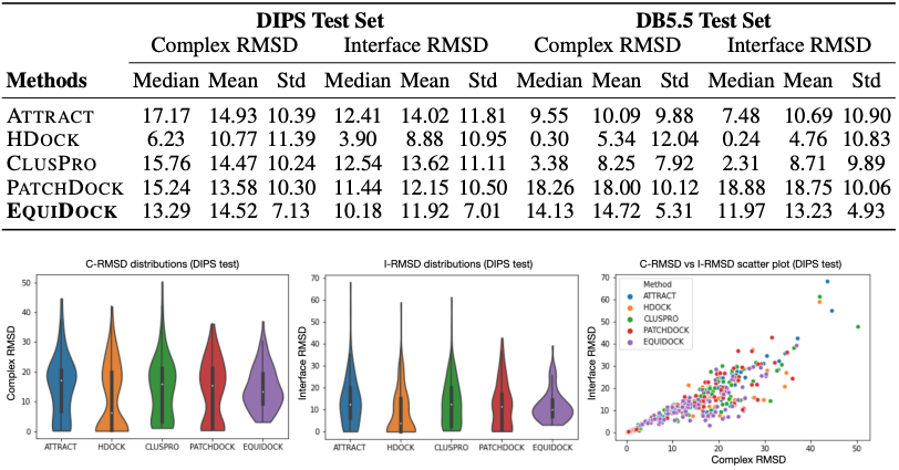 EQUIDOCK复合物预测结果:优于基线。该方法不使用采样,排序,不依赖于手工特征,并且不执行结构微调,旨在直接预测SE(3)配体转换。