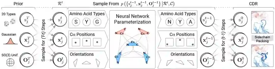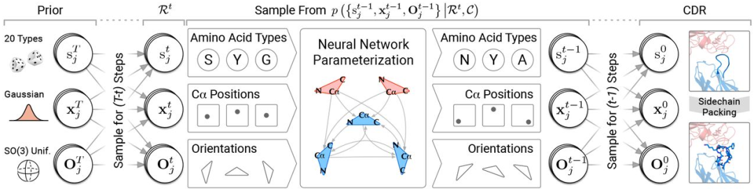 生成扩散过程的图示。在每一步,网络将当前的CDR状态作为输入,并将CDR的序列、位置、方向的分布参数化以用于下一步。最后,通过侧链打包算法构建全原子结构。