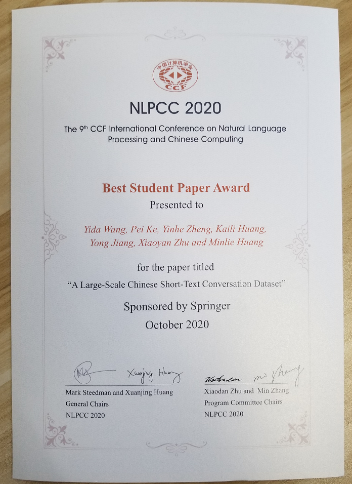 至于这篇NLPCC最佳学生论文,虽然是我努力去完成的工作,但还是多亏了黄老师的眼光和指导。