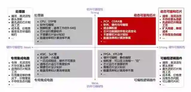 因为其特点是软件硬件都可以编程、混合粒度、芯片的硬件功能随软件的变化而变化,应用改变软件、软件再改变硬件,所以无论是在国内还是国外,可重构芯片很多时候被误解成 FPGA。