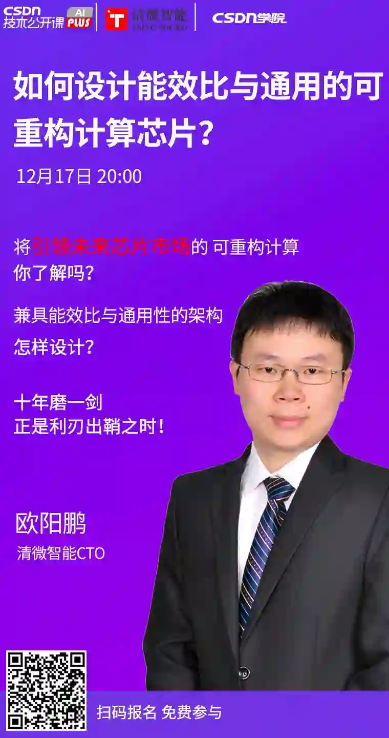 为跟上技术潮流,你一定不会想要错过这次机会:清微智能 CTO 欧阳鹏将亲临本次免费公开课直播间,面对面详解可重构计算架构,对这个话题感兴趣的童鞋可实时提出自己的疑问,欧阳鹏博士将在直播间与观众互动并答疑。