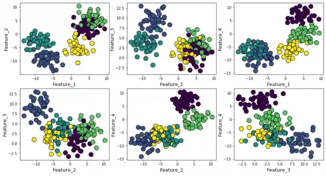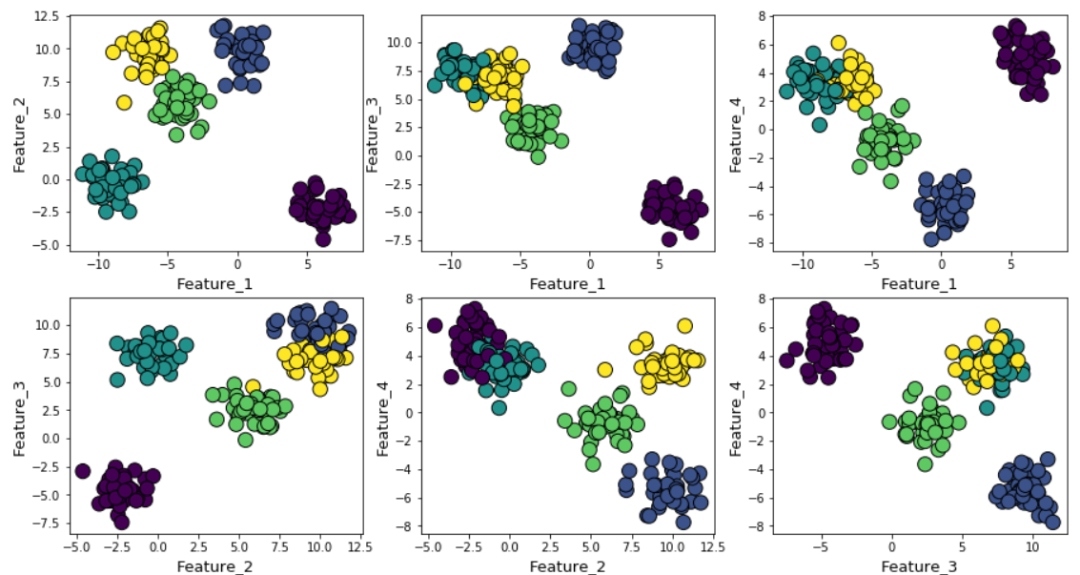 为了说明,我们使用Scikit-learn的make_blob 函数在4个特征维度和5个聚类中心上生成随机数据点。因此,这个问题的基本事实是,数据是在5个聚类中心附近生成的。然而,k-means算法无法知道这一点。
