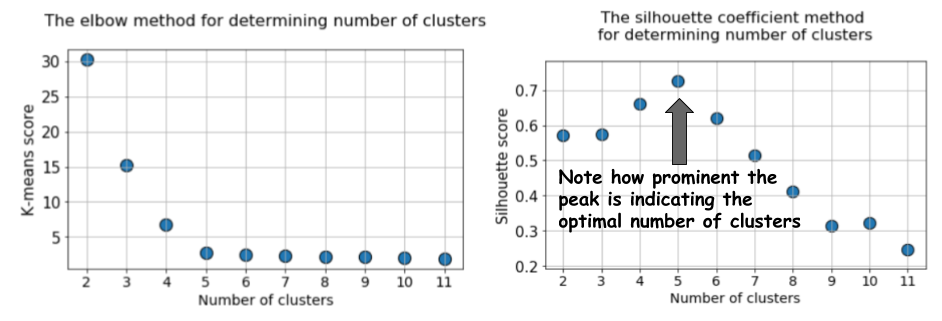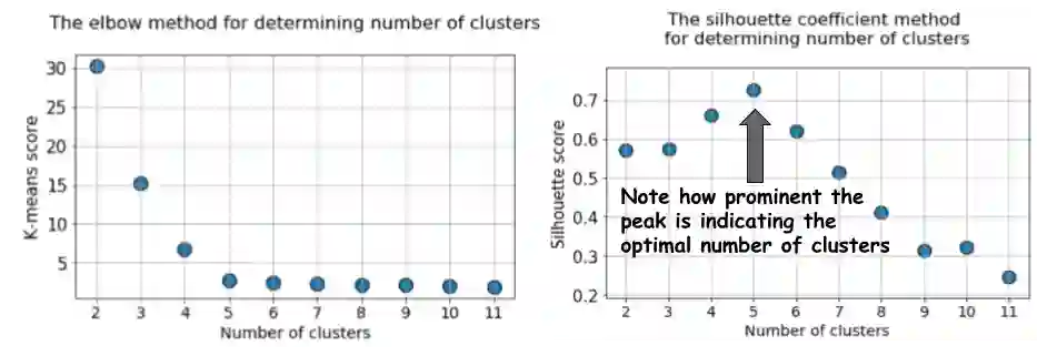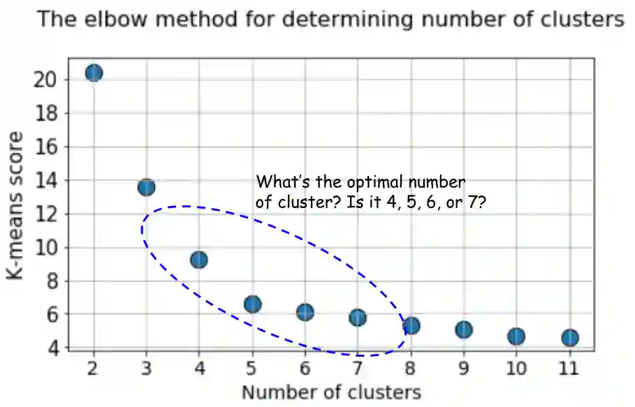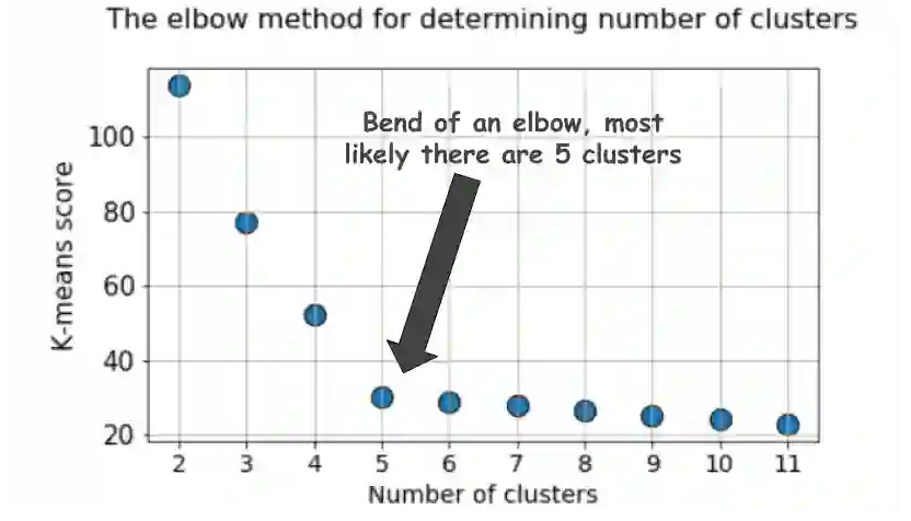 对于经常使用的elbow方法,我们讨论了几个备选方案,用于使用k-means算法在无监督学习设置中挑选出正确数量的聚类。我们表明,Silhouette系数和BIC评分(来自k-means的GMM扩展)是比elbow方法更好的可视化识别最优簇数的方法。