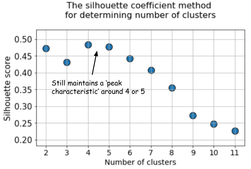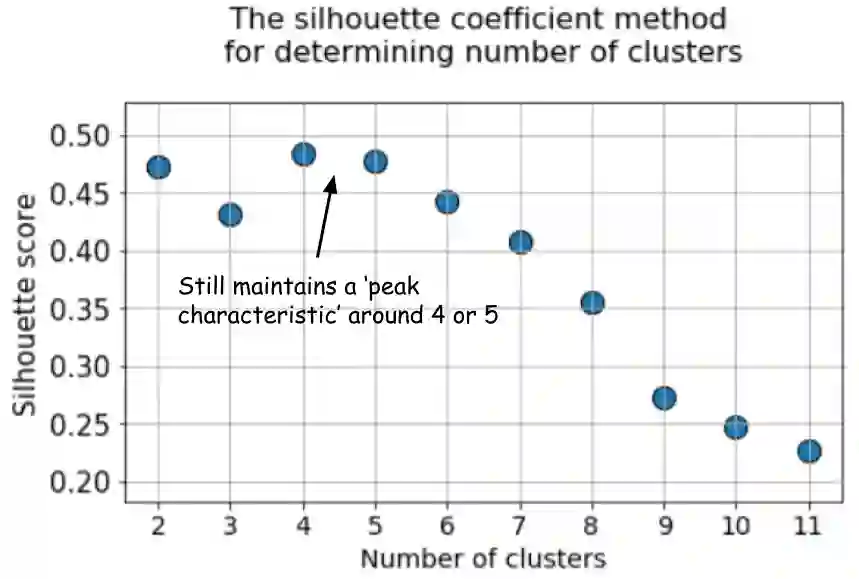 silhouette系数与elbow法的平缓弯曲相比,表现出峰值特性。这更容易可视化和归因。