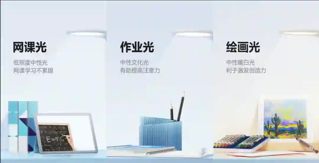 除了这些基本的照明素质,为了更好地保护视力,有道还对用光场景进行了细分。通过自适应光算法,根据学习场景和环境光线,进行智能自动调节,不仅能调亮度还能调色温,例如在学习、阅读时,有道智能学习灯会发出中性温和光,更有助于提高孩子的专注力;而上网课时,就会给出低照度中性光,这样能够有效减少屏幕的反光,缓解视疲劳;在进行绘画等创造性的活动时,则会切换成中性暖白光,更有利于激发孩子的创造力。