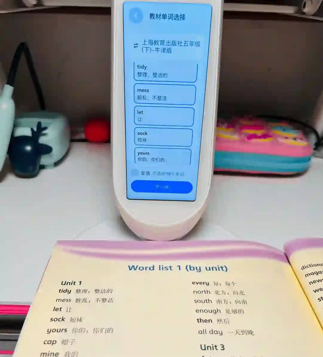 学习灯还内置听写功能,匹配好了各个年级的多版本英语教材,可以由孩子自己完成听写训练。我实际测试了一下,选好年级和教材版本,就能找到对应的词汇列表,可以按照单元,对单词具体勾选。听写时,可以选择英文,中文不同的听写方式,还可以进行乱序调整。有了这个功能,我们也彻底解放了,对于我们这些口语不大行的家长,听写读音不标准,还要被孩子笑话一通。