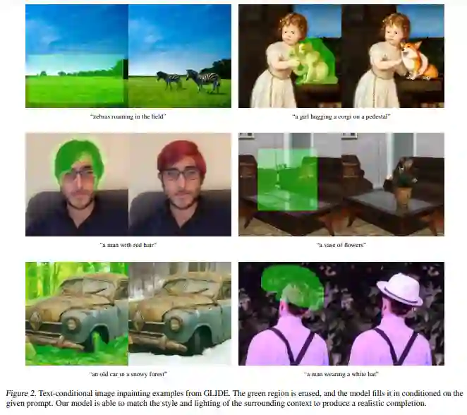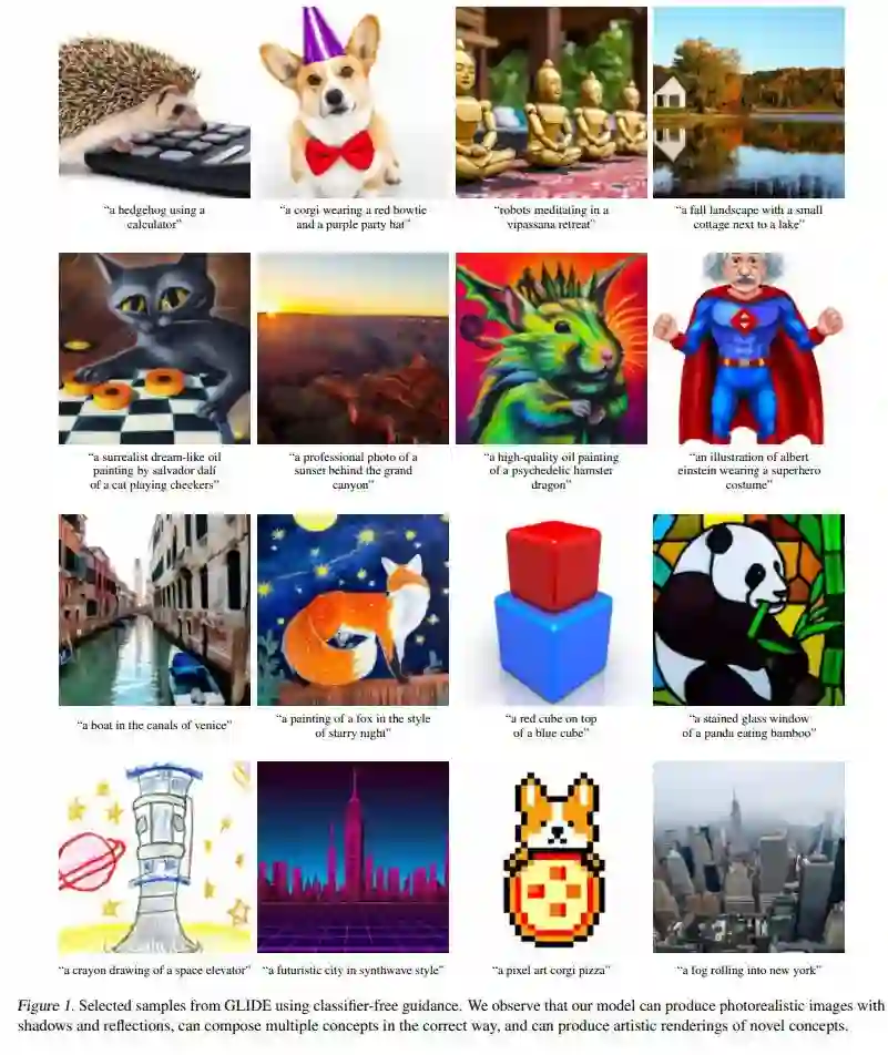 如下图 1 所示,GLIDE 通常会生成逼真的阴影和反射,以及高质量的纹理。此外,该模型还能够组合多个概念(例如柯基犬、领结和生日帽),同时将属性(例如颜色)绑定到这些对象。